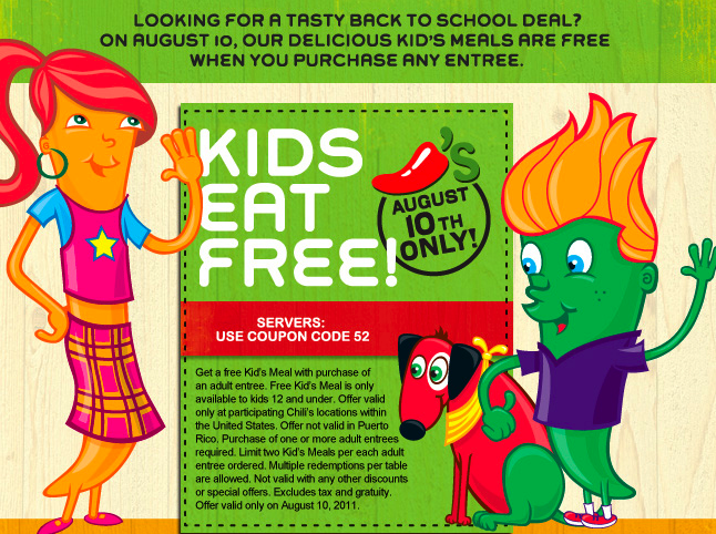 Today Chili’s is offering FREE Kid’s Meals! Available to kids 12 and under. Limit two kid’s meals per adult entree ordered. Valid 8/22 only.